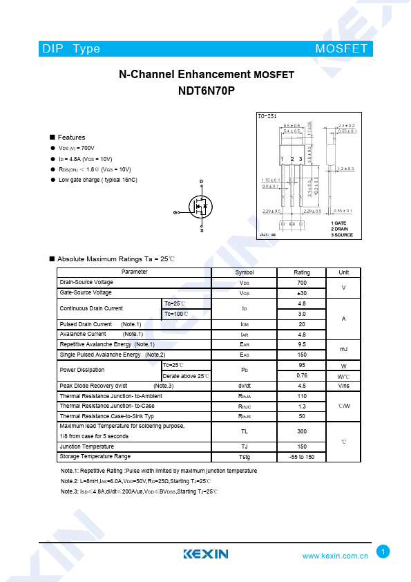 ● VDS (V) = 700V ● ID = 4.8A (VGS = 10V) ● RDS(ON) < 1.8Ω (VGS = 10V) ● Low gate charge ( typical 16nC)