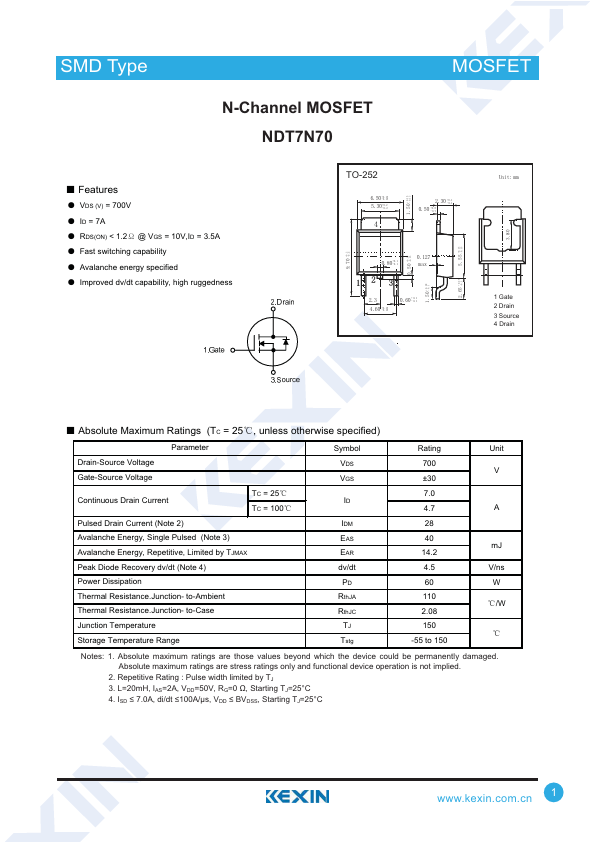 ƽ VDS (V) = 700V ƽ ID = 7A ƽ RDS(ON) < 1.2ಳ @ VGS = 10V,ID = 3.5A ƽ Fast switching capability ƽ Avalanche energy specified ƽ Improved dv/dt capability, high ruggedness