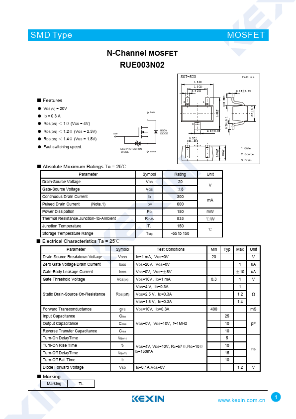 ● VDS (V) = 20V ● ID = 0.3 A ● RDS(ON) < 1Ω (VGS = 4V) ● RDS(ON) < 1.2Ω (VGS = 2.5V) ● RDS(ON) < 1.4Ω (VGS = 1.8V) ● Fast switching speed.