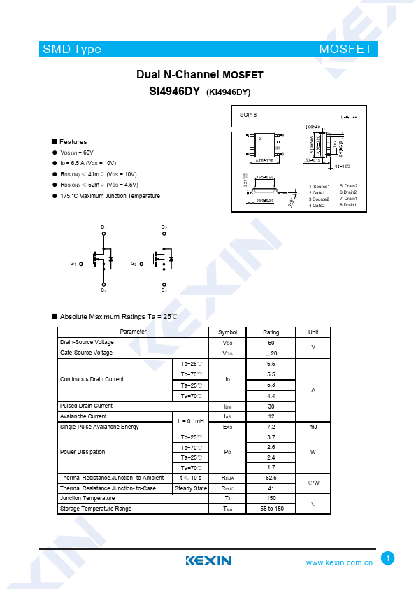 ● VDS (V) = 60V ● ID = 6.5 A (VGS = 10V) ● RDS(ON) < 41mΩ (VGS = 10V) ● RDS(ON) < 52mΩ (VGS = 4.5V) ● 175 °C Maximum Junction Temperature