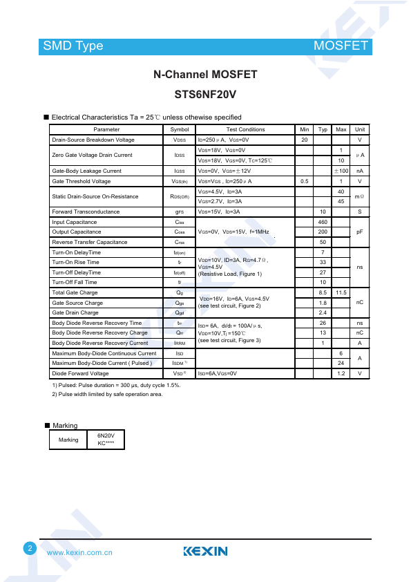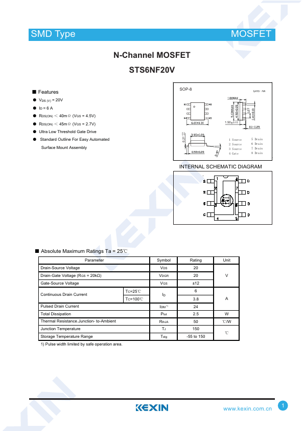ƽ VDS (V) = 20V ƽ ID = 6 A ƽ RDS(ON) ˘ 40m¡ (VGS = 4.5V) ƽ RDS(ON) ˘ 45m¡ (VGS = 2.7V) ƽ Ultra Low Threshold Gate Drive ƽ Standard Outline For Easy Automated