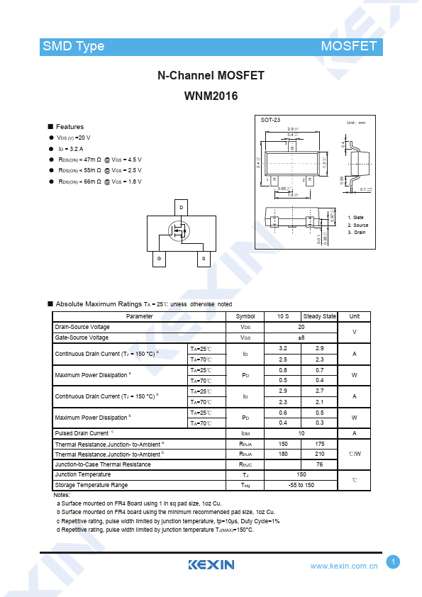 ● VDS (V) =20 V ● ID = 3.2 A ● RDS(ON) < 47m Ω @ VGS = 4.5 V ● RDS(ON) < 55m Ω @ VGS = 2.5 V ● RDS(ON) < 66m Ω @ VGS = 1.8 V