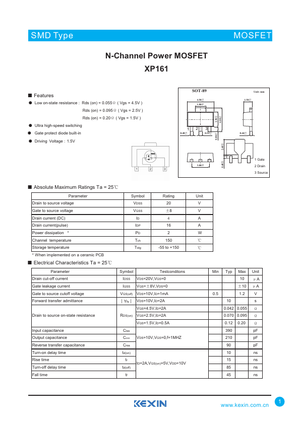 ● Low on-state resistance : Rds (on) = 0.055Ω ( Vgs = 4.5V ) Rds (on) = 0.095Ω ( Vgs = 2.5V ) Rds (on) = 0.20Ω ( Vgs = 1.5V )