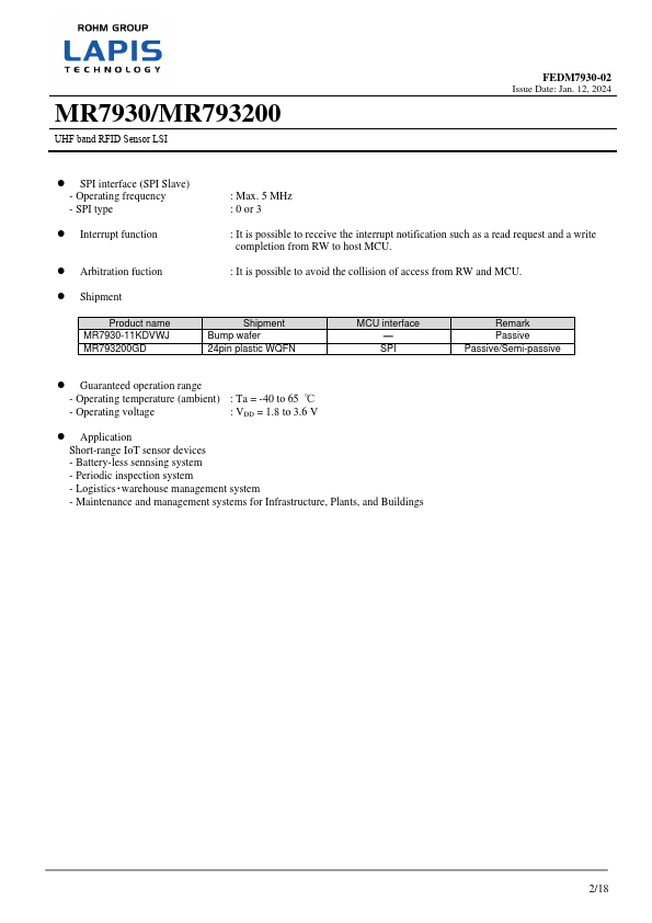 MR7930/MR793200 is a passive UHF band RFID Sensor LSI for the battery-less short-range IoT devices. This LSI is equipped with sensor function to measure electrostatic capacitance. It is possible to control sensor function by the mandatory command (READ, WRITE) from Reader/Writer (RW ; interrogator) that is compliant with the international standard EPC global Generation2-Ver.2.0.1 (EPC standard or EPC Gen2). MR7930 is bump wafer product for inlay tag. MR793200 is package product that has SPI slave interface.