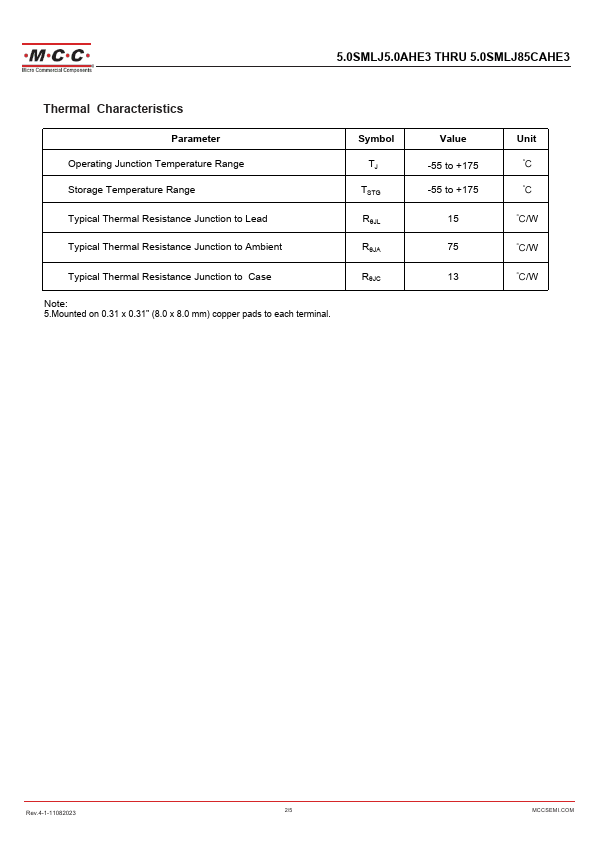 This page provides the datasheet information for the 5.0SMLJ20AHE3, a member of the 5.0SMLJ5.0AHE3 5000 Watt TVS family.