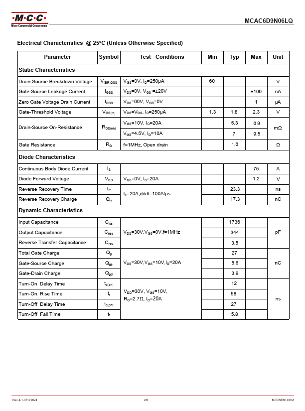 • Operating Junction Temperature Range : -55°C to +175°C • Storage Temperature Range: -55°C to +175°C • Thermal Resistance: 55°C/W Junction to Ambient(Note2) • Thermal Resistance: 1.
