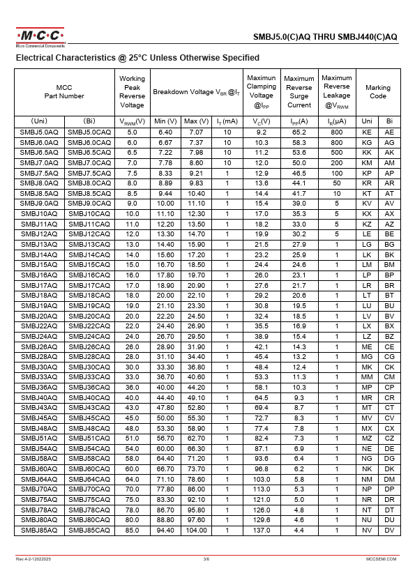 This page provides the datasheet information for the SMBJ26AQ, a member of the SMBJ5.0AQ 600 Watt TVS family.