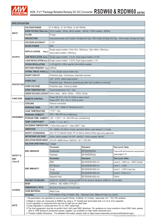 RSDW60 and RDDW60 series are 60W module type DC-DC reliable railway converter with 2"x1" package.