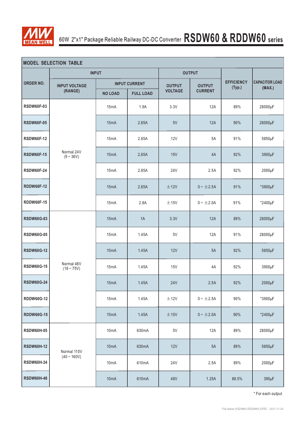 This datasheet PDF includes multiple part numbers: RSDW60H-48, RSDW60F-03. Please refer to the document for exact specifications by model. |