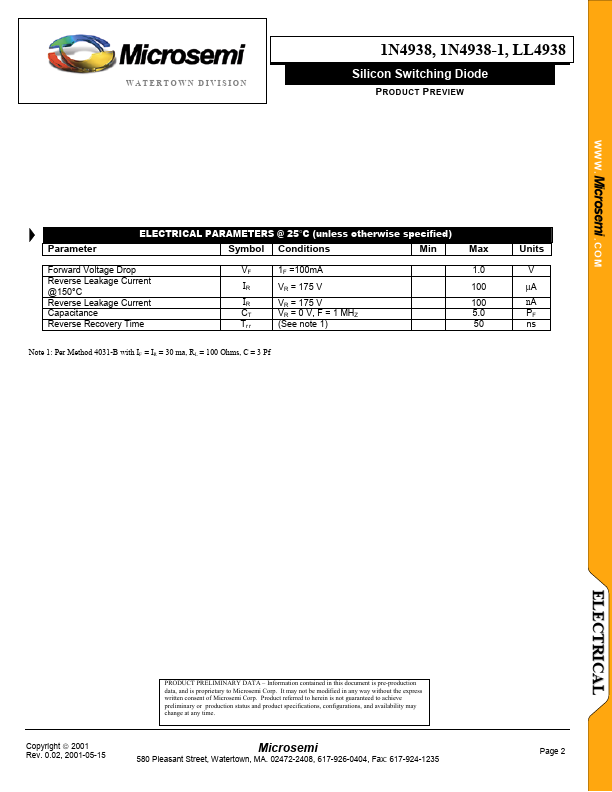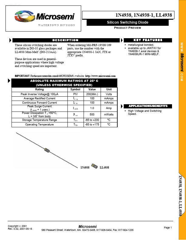 | 1N4938UR-1 | SWITCHING DIODE | Microsemi Corporation |