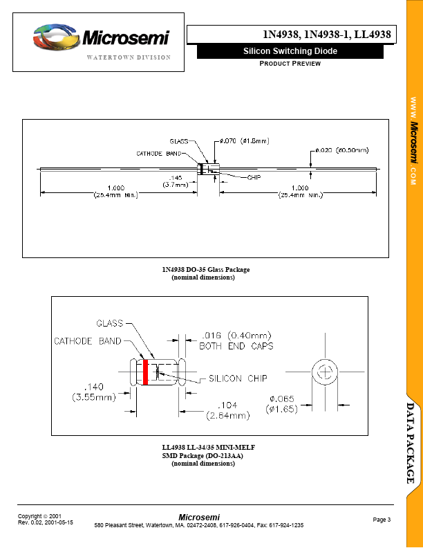 These silicon switching diodes are available in DO-35 glass packages and LL4938 Mini-Melf (DO-213AA).