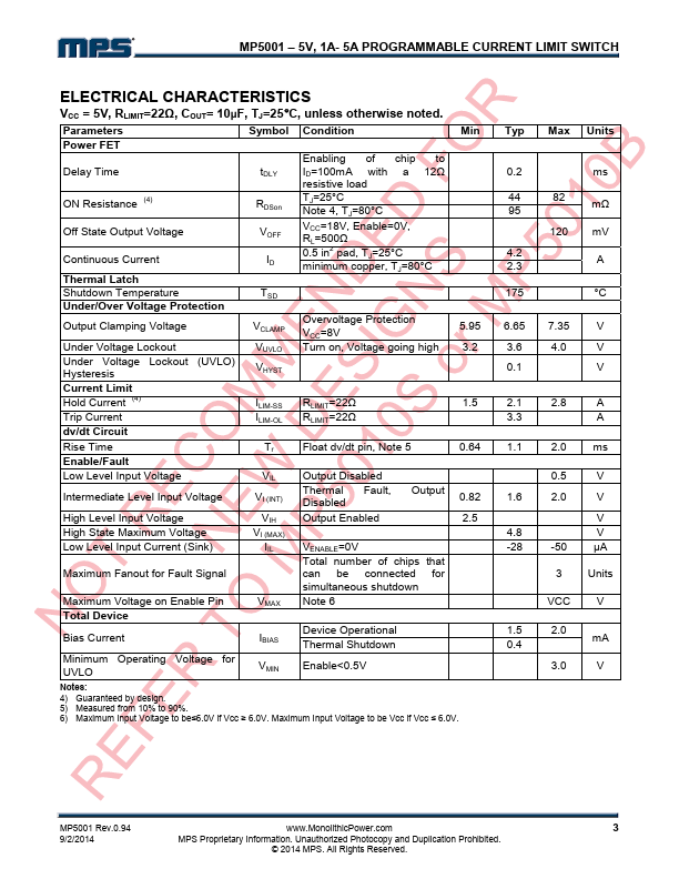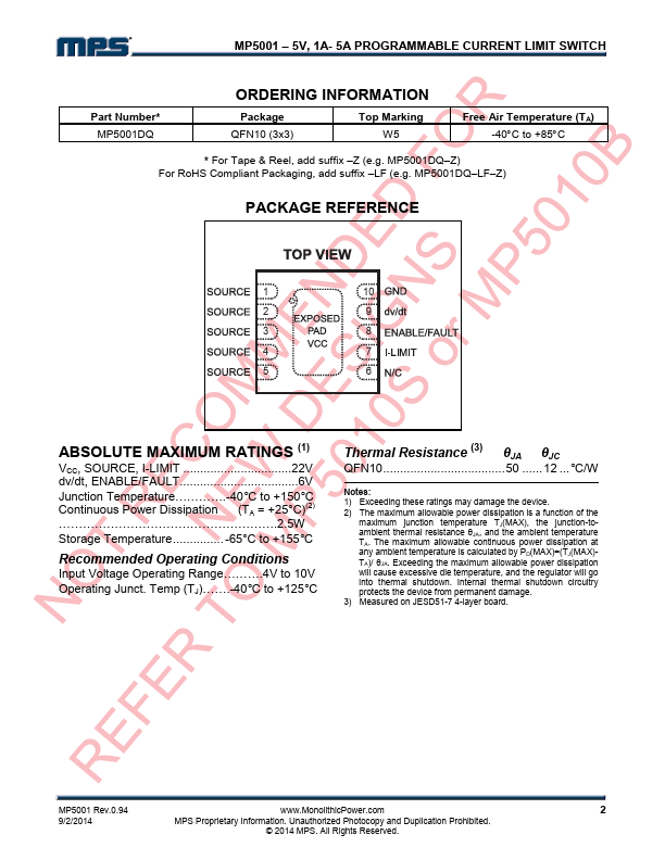 The MP5001 is a protection device designed to protect circuitry on the output (source) from transients on input (VCC).