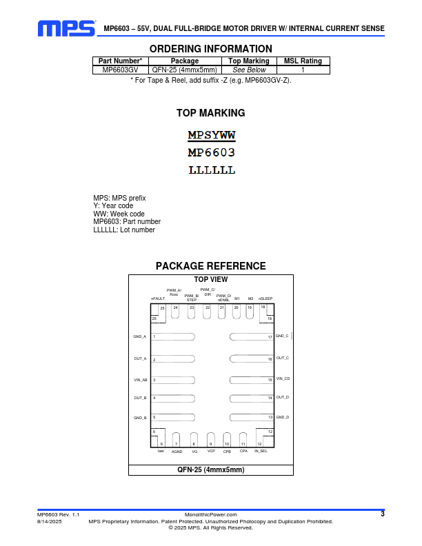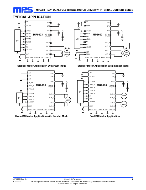 The MP6603 is a dual full-bridge motor driver with integrated low-on resistance (RDS(ON)) MOSFETs.