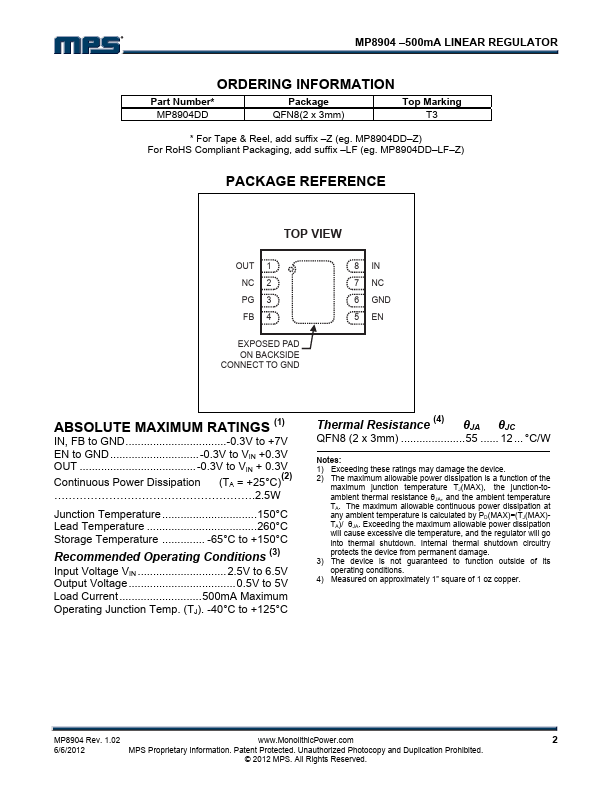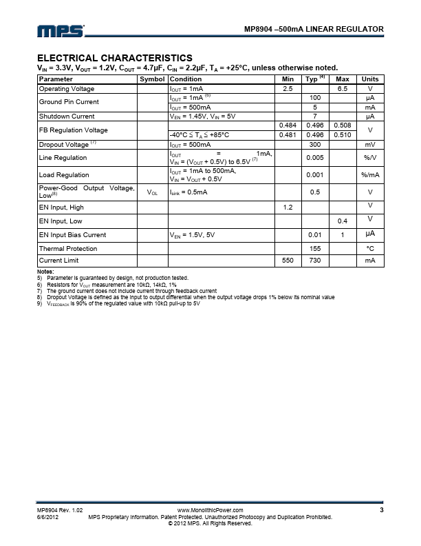 The MP8904 is a low-current, low-dropout, linear regulator that operates on a single 2.5Vto-6.5V input supply.