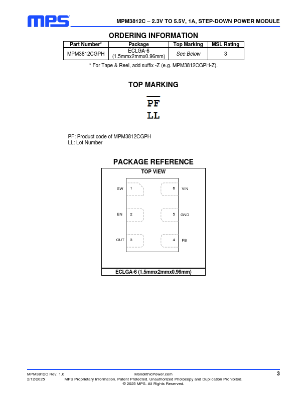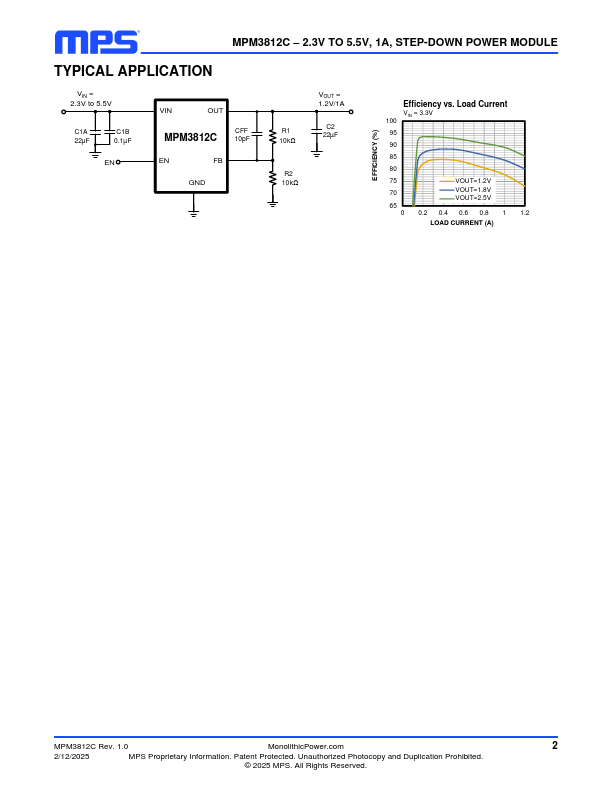 The MPM3812C is a monolithic, step-down switch-mode converter with built-in, internal power MOSFETs and an inductor.