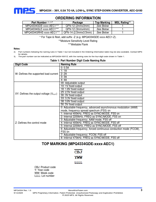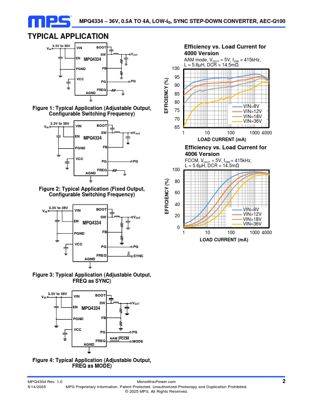 The MPQ4334 is a configurable-frequency (200kHz to 2.5MHz), synchronous, step-down switching regulator with integrated internal highside and low-side power MOSFETs (HS-FET and LS-FET, respectively).