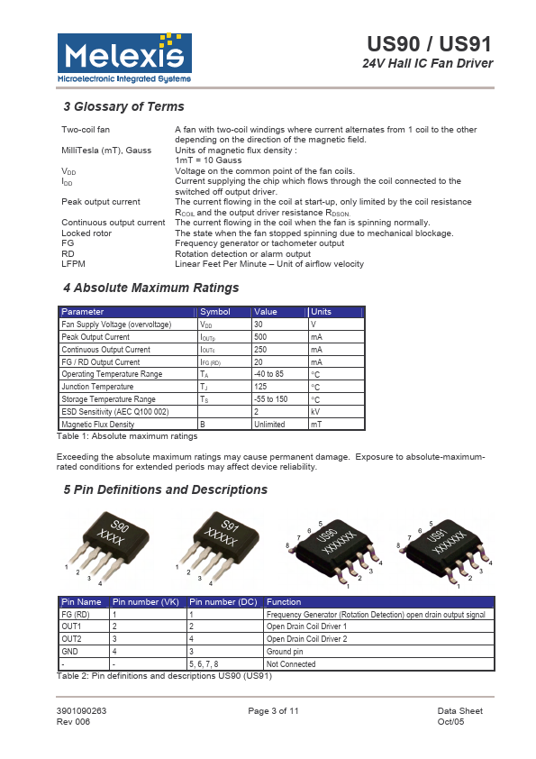 This page provides the datasheet information for the US91, a member of the US90 24V Hall IC Fan Driver family.