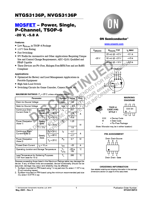 NTGS3136P, NVGS3136P MOSFET – Power, Single, P-Channel, TSOP-6 -20 V, -5.8 A Features • Low RDS(on) in TSOP−6 Package • 1.8 V Gate Rating • Fast Switching • NV Prefix for Automotive and Other Applications Requiring Unique Site and Control Change Requirements; AEC−Q101 Qualified and PPAP Capable • These Devices are Pb−Free, Halogen Free/BFR Free and are RoHS Compliant Applications • Optimized for Battery and Load Management Applications in Portable Equipment • High Side Load Switch • Switching Circuits for Game Consoles, Camera Phone, etc. MAXIMUM RATINGS (TJ = 25°C unless otherwise stated) Parameter Symbol Value Unit Drain−to−Source Voltage VDSS −20 V Gate−to−Source Voltage VGS $8.0 V Continuous Drain Current (Note 1) Steady TA = 25°C ID State TA = 85°C −5.1 −3.