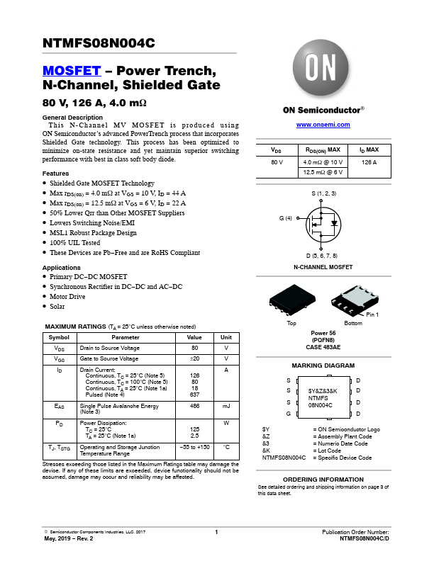 • Shielded Gate MOSFET Technology • Max rDS(on) = 4.0 mW at VGS = 10 V, ID = 44 A • Max rDS(on) = 12.