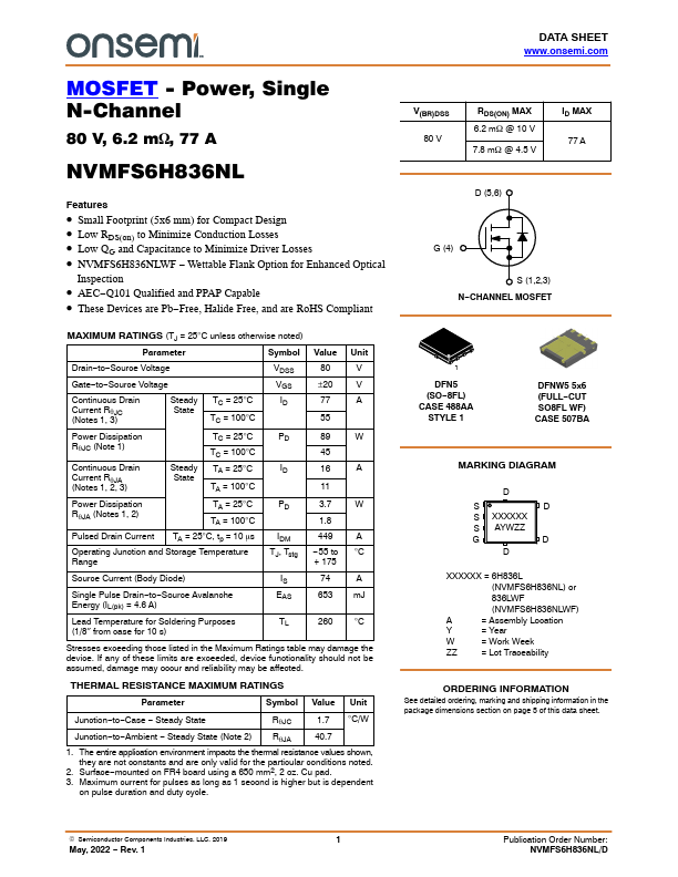 • Small Footprint (5x6 mm) for Compact Design • Low RDS(on) to Minimize Conduction Losses • Low QG and Capacitance to Minimize Driver Losses • NVMFS6H836NLWF − Wettable Flank Option for Enhanced Optical
