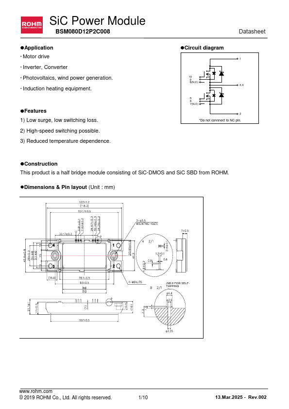 lConstruction This product is a half bridge module consisting of SiC-DMOS and SiC SBD from ROHM.