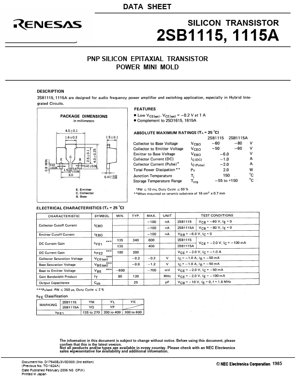 | 2SB1115 | PNP SILICON EPITAXIAL TRANSISTOR |