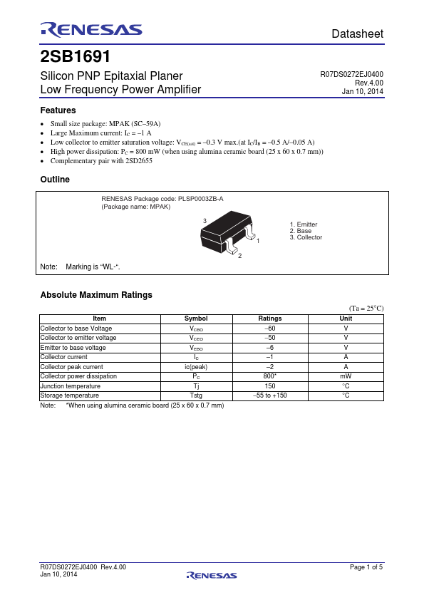 | 2SB1690 | Silicon PNP Transistor | Rohm |