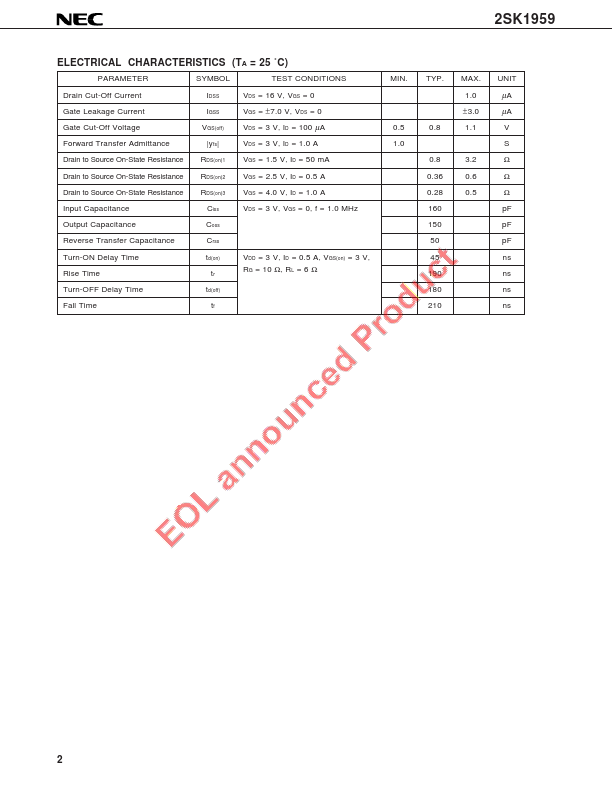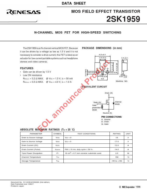 RDS(on) = 3.2 Ω MAX. @ VGS = 1.5 V, ID = 50 mA RDS(on) = 0.5 Ω MAX. @ VGS = 4.0 V, ID = 1.0 A