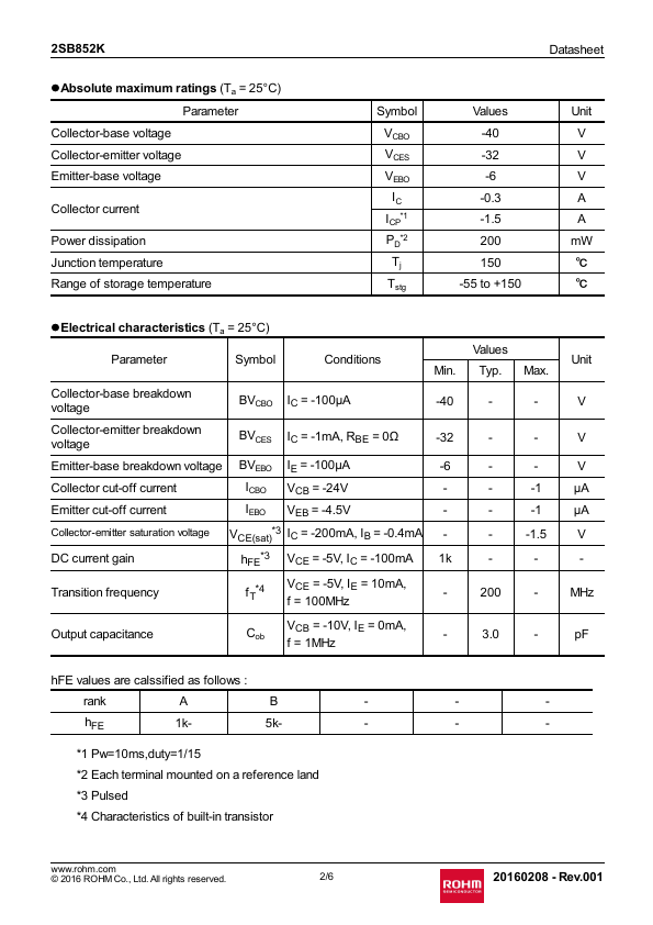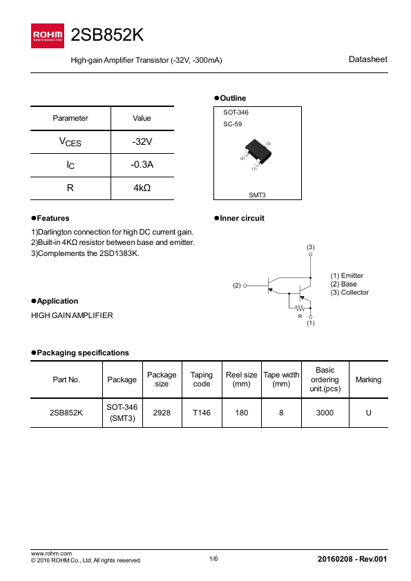 1)Darlington connection for high DC current gain. 2)Built-in 4KΩ resistor between base and emitter. 3)Complements the 2SD1383K.