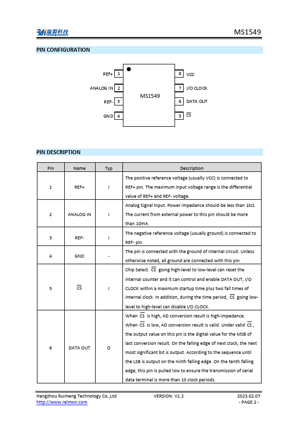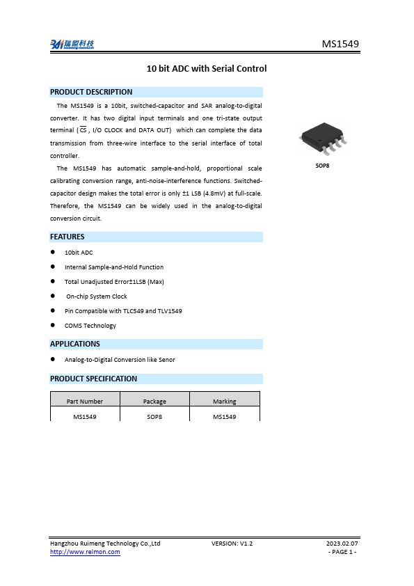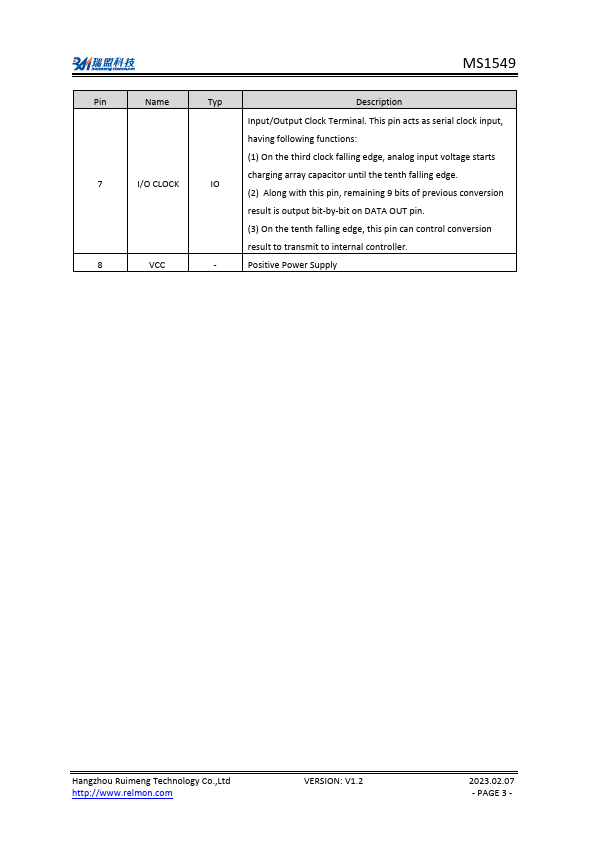 The MS1549 is a 10bit, switched-capacitor and SAR analog-to-digital converter. It has two digital input terminals and one tri-state output terminal ( CS , I/O CLOCK and DATA OUT) which can complete the data transmission from three-wire interface to the serial interface of total controller.
