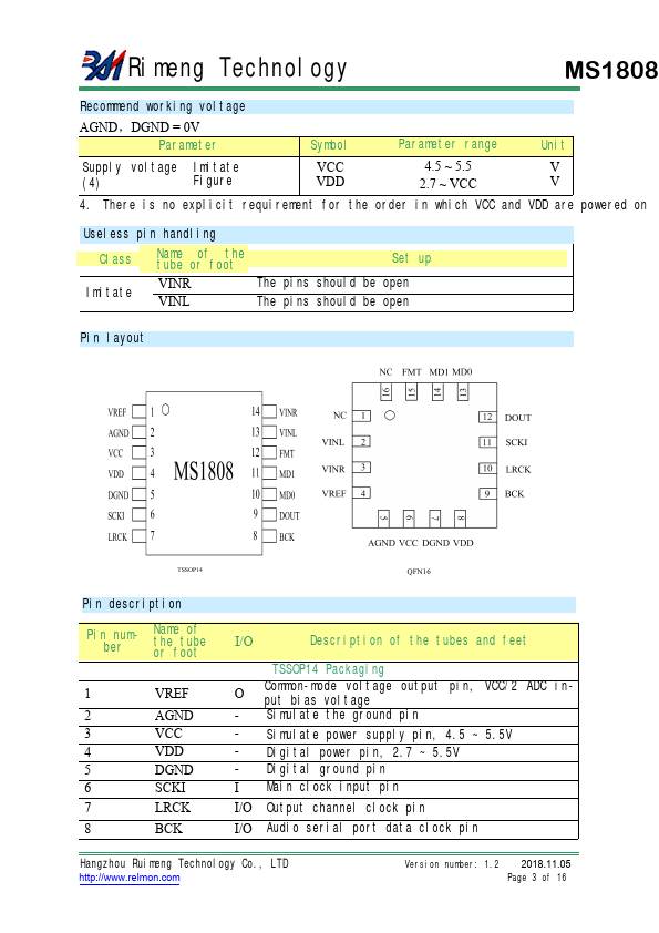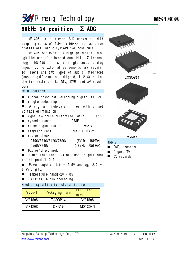 MS1808 Achieves its high precision through the use of enhanced dual-bit ΔΣ technology. MS1808 It is a single-ended analog input, so no external components are required. There are two types of audio interfaces (most significant bit aligned, I 2 S) suitable for systems like DTV, DVR, and AV receivers.