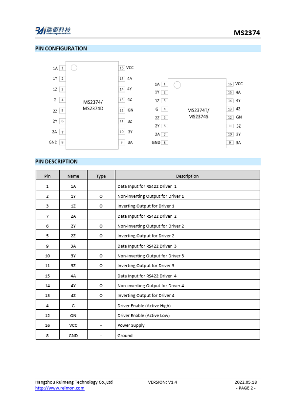 The MS2374 series is a four-channel complementary line driver, which meets the demands of ANSI TIA/EIA-422-B and ITU (original CCITT) suggestion V.11.