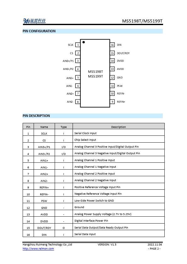 The MS5198T/MS5199T is a 16bit/24bit ADC featured by low power dissipation, low noise, three differential input channels and it is suitable for highprecision measurement application.