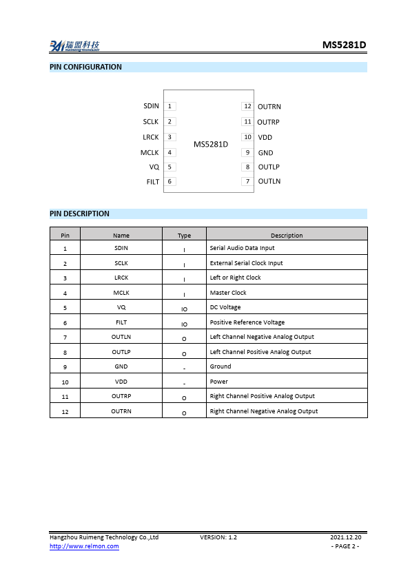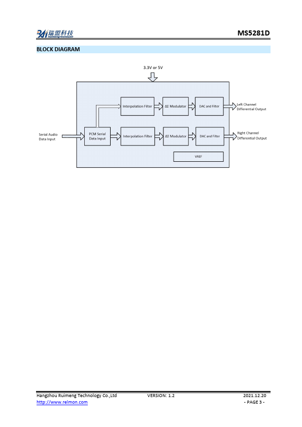The MS5281D is a stereo digital-to-analog converter chip, which contains interpolation filter, a multi-bit Δ-Σ modulator, differential output analog filter.