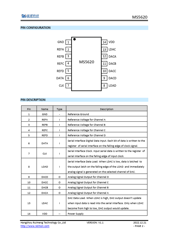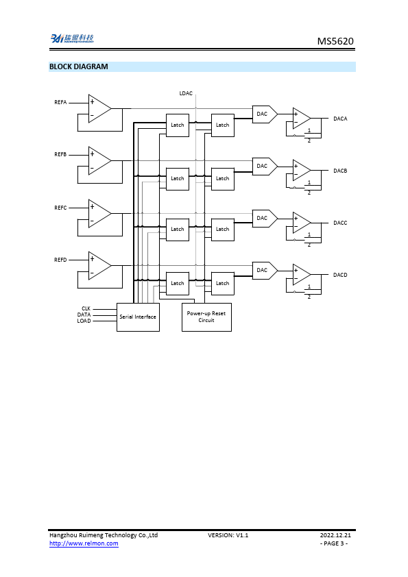The MS5620 is a quadruple, serial 8-bit voltage output digital-to-analog converter (DAC) featured by buffered reference inputs (high impedance). The output voltage range is from one or two times the reference voltage to GND and DAC is monotonic. The MS5620 is simple to use, because it operates in a single power supply, 3V to 5V. The power-up reset function can ensure repeatable start-up condition.