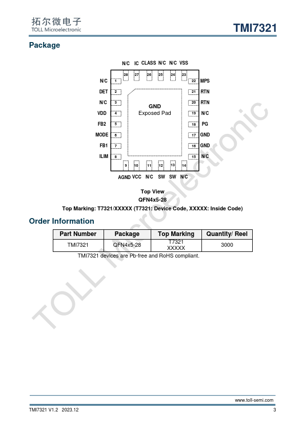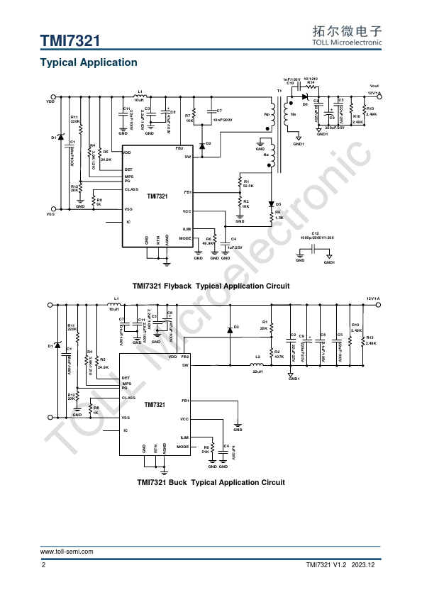 The TMI7321 is an integrated IEEE 802.3af PoE compliant Powered Device (PD) power supply solution.