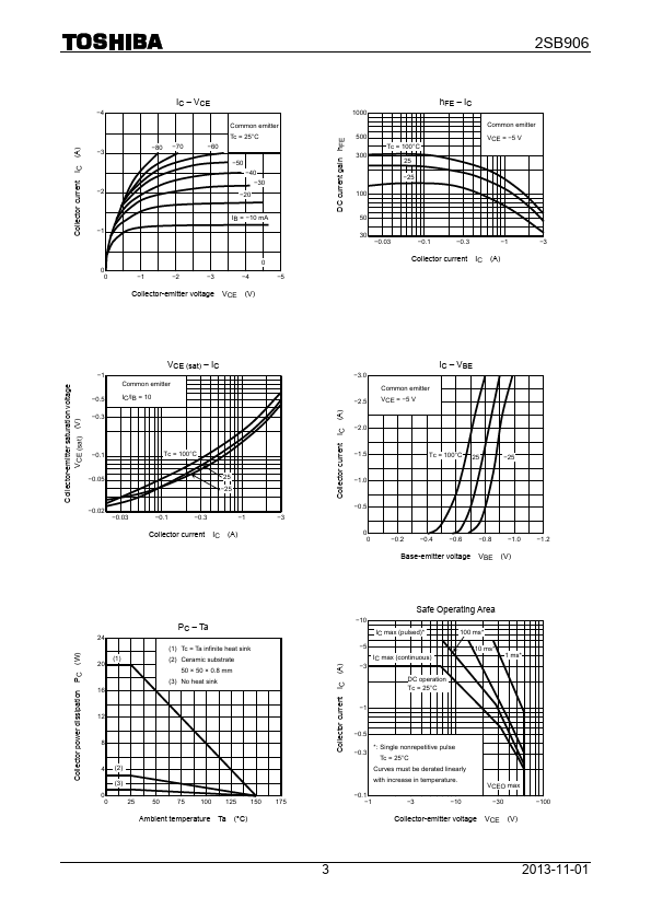 • Low collector saturation voltage : VCE (sat) = −1.0 V (typ.) (IC = −3 A, IB = −0.3 A)