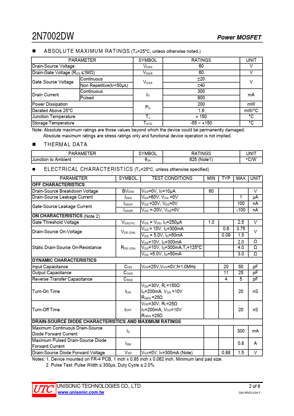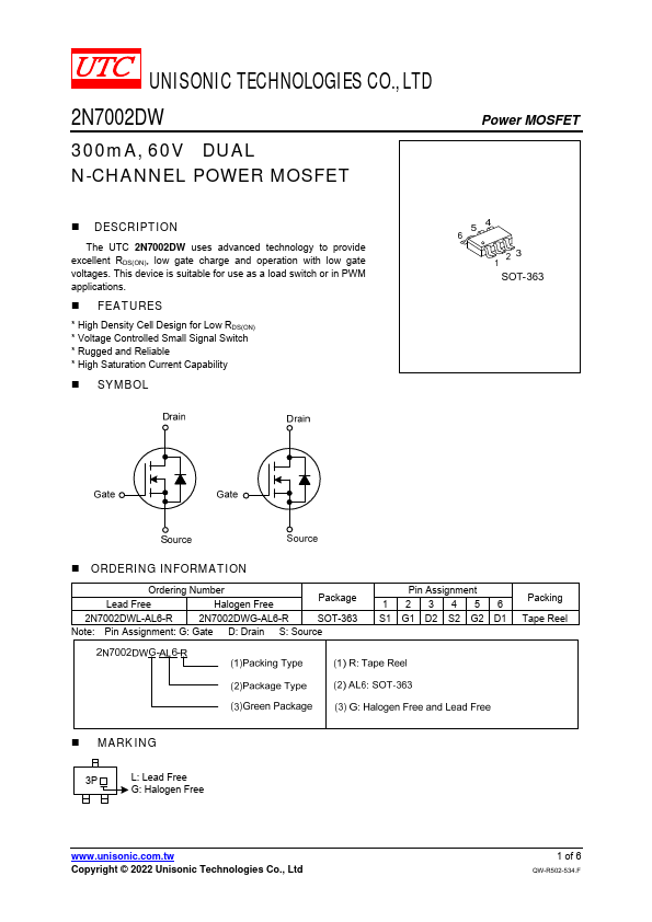 The UTC 2N7002DW uses advanced technology to provide excellent RDS(ON), low gate charge and operation with low gate voltages. This device is suitable for use as a load switch or in PWM applications.