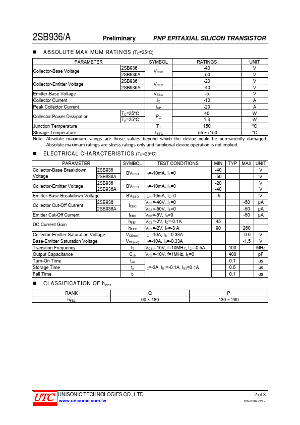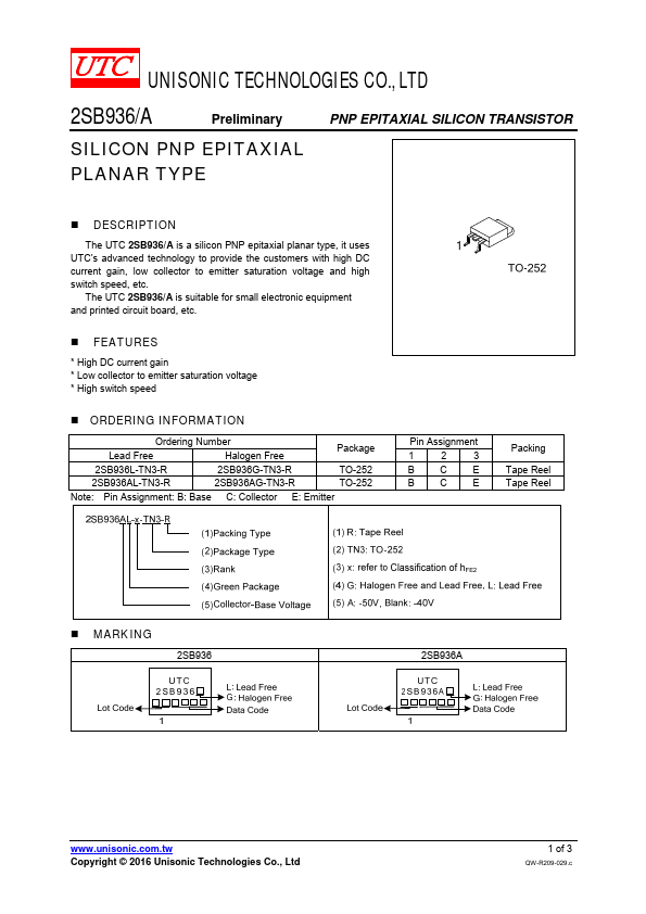 The UTC 2SB936/A is a silicon PNP epitaxial planar type, it uses UTC’s advanced technology to provide the customers with high DC current gain, low collector to emitter saturation voltage and high switch speed, etc.