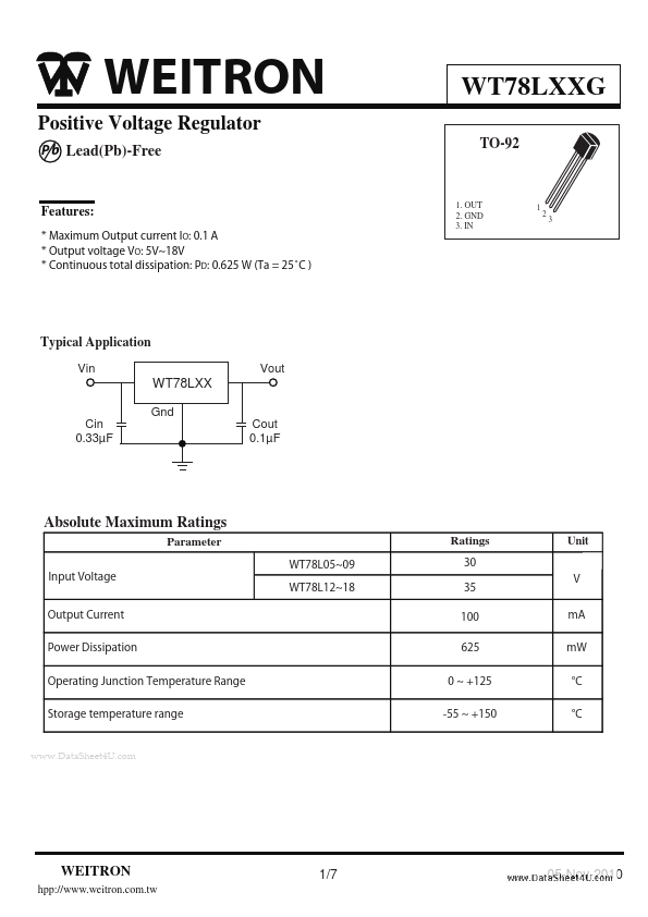 WEITRON Positive Voltage Regulator P b Lead(Pb)-Free Features: * Maximum Output current IO: 0.1 A * Output voltage VO: 5V~18V * Continuous total dissipation: PD: 0.625 W ...