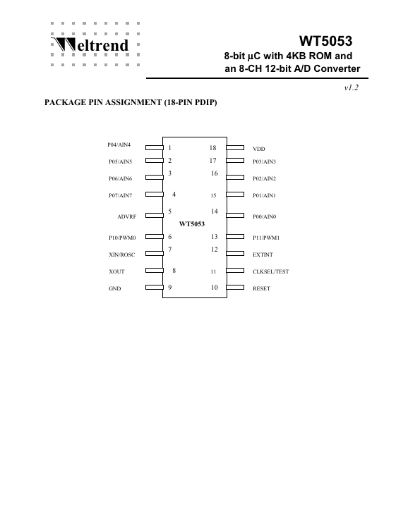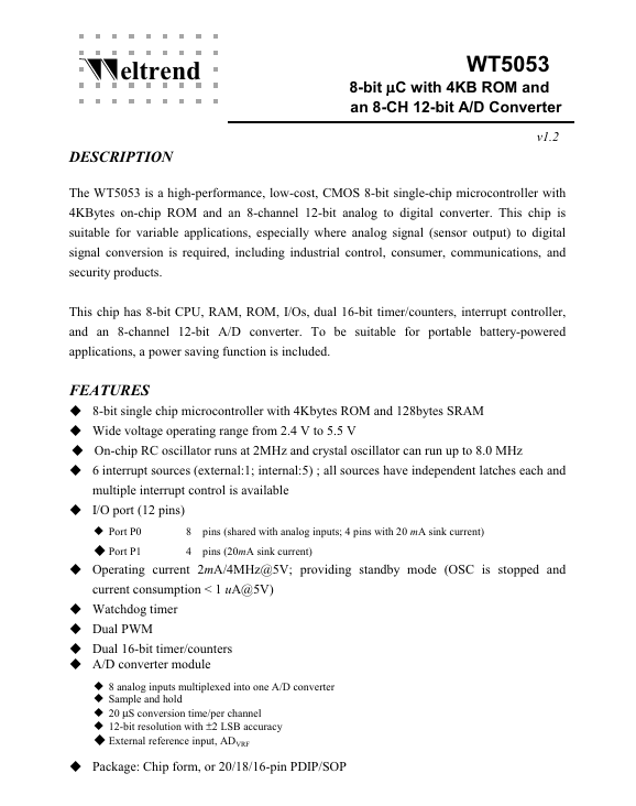 Datasheet Details Part number WT5053 Manufacturer Weltrend Semiconductor File Size 112.30 KB Description 8-bit uC with 4KB ROM and and 8-CH 12-bit A/D Converter Datasheet WT5053 Datasheet