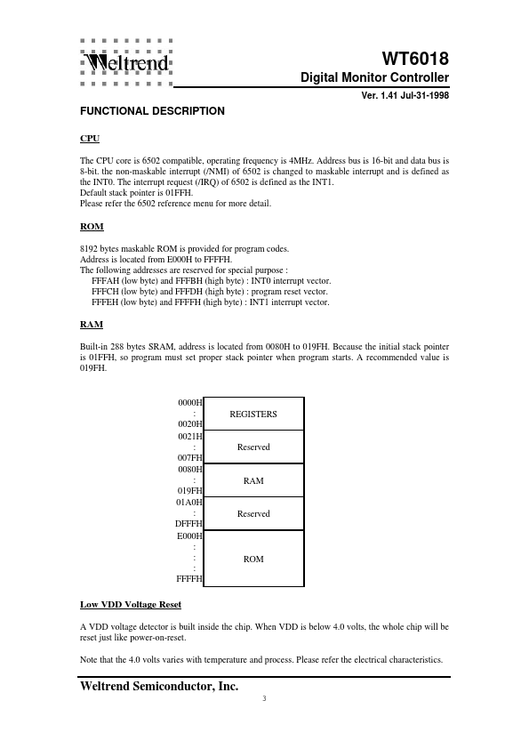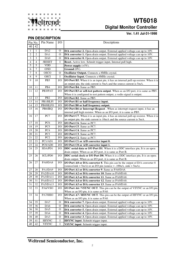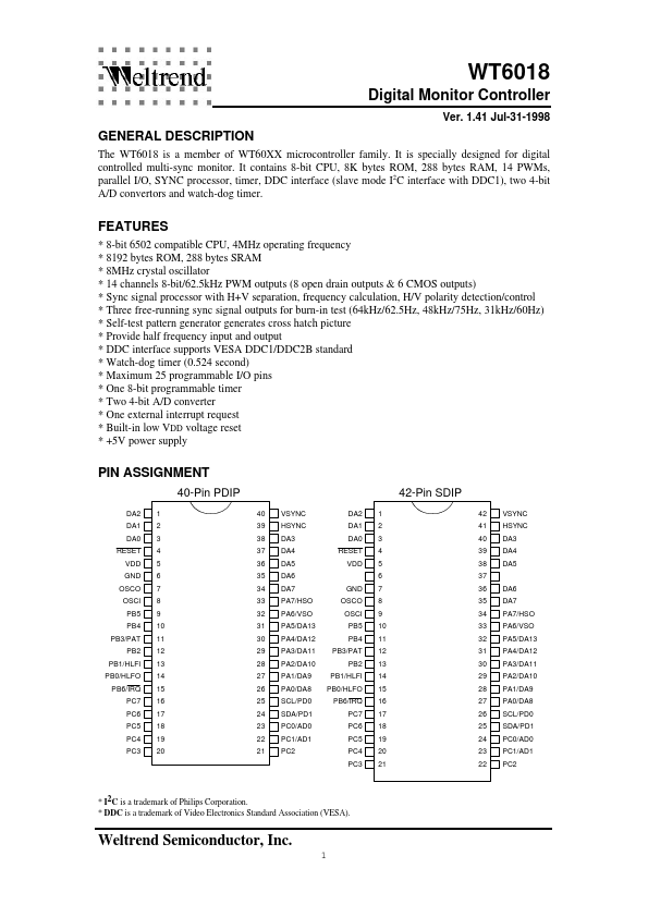 The WT6018 is a member of WT60XX microcontroller family. It is specially designed for digital controlled multi-sync monitor. It contains 8-bit CPU, 8K bytes ROM, 288 bytes RAM, 14 PWMs, parallel I/O, SYNC processor, timer, DDC interface (slave mode I2C interface with DDC1), two 4-bit A/D convertors and watch-dog timer.