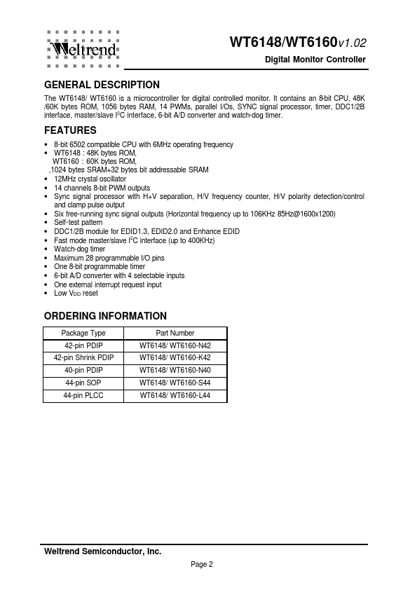 The WT6148/ WT6160 is a microcontroller for digital controlled monitor.