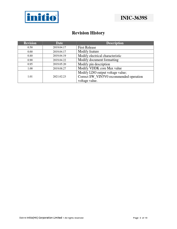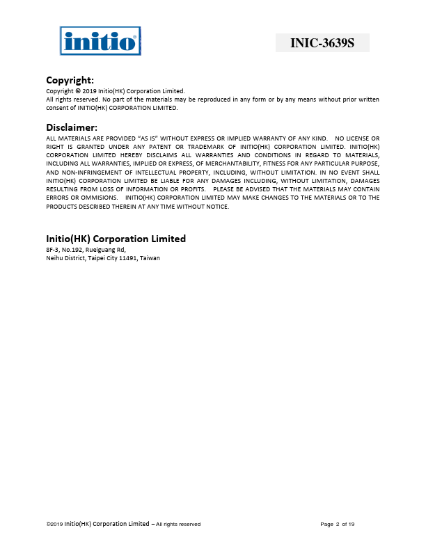 First Release Modify feature Modify electrical characteristic Modify document formatting Modify pin description Modify VDDK core Max value Modify LDO output voltage value; Correct SW_VIN5V0 recommended operation voltage value. All rights reserved Page 3 of 19 INIC-3639S TABLE OF CONTENTS CHAPTER 1 GENERAL DESCRIPTION 5 CHAPTER 2 FEATURE 6 2.1 Embedded Processor 6 2.2 USB3.1 Gen1 Interface (Device) 6 2.3 SATA Interface (Host) 6 2.4 SPI/SMART CARD