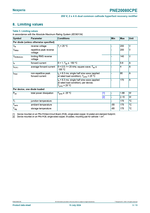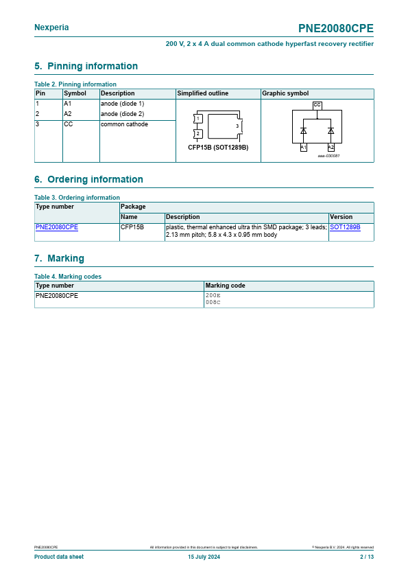 High power density, hyperfast switching time dual recovery rectifier in common cathode configuration with high-efficiency planar technology, encapsulated in a CFP15B (SOT1289B) power and flat lead Surface-Mounted Device (SMD) plastic package.