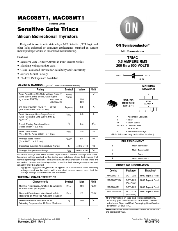 • Sensitive Gate Trigger Current in Four Trigger Modes • Blocking Voltage to 600 Volts • Glass Passivated Surface for Reliability and Uniformity • Surface Mount Package • Pb−Free Packages are Available