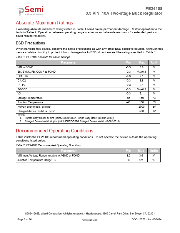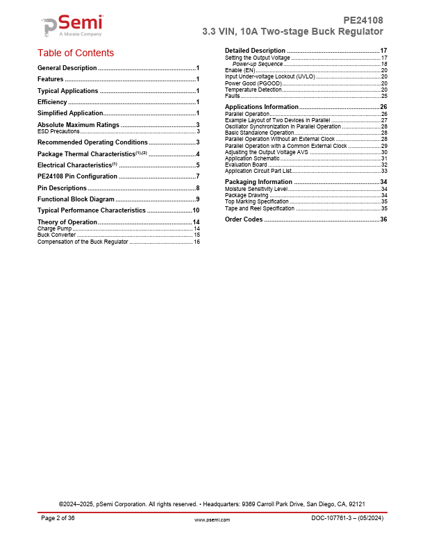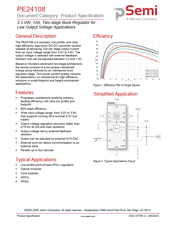 The PE24108 is a compact, low-profile, and ultrahigh efficiency step-down DC-DC converter solution capable of delivering 10A per stage output current from an input voltage range from 3.0V to 3.6V. The output voltage is selected with external feedback resistors and can be adjusted between 0.4 and 1.0V.