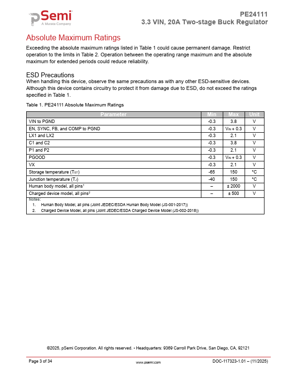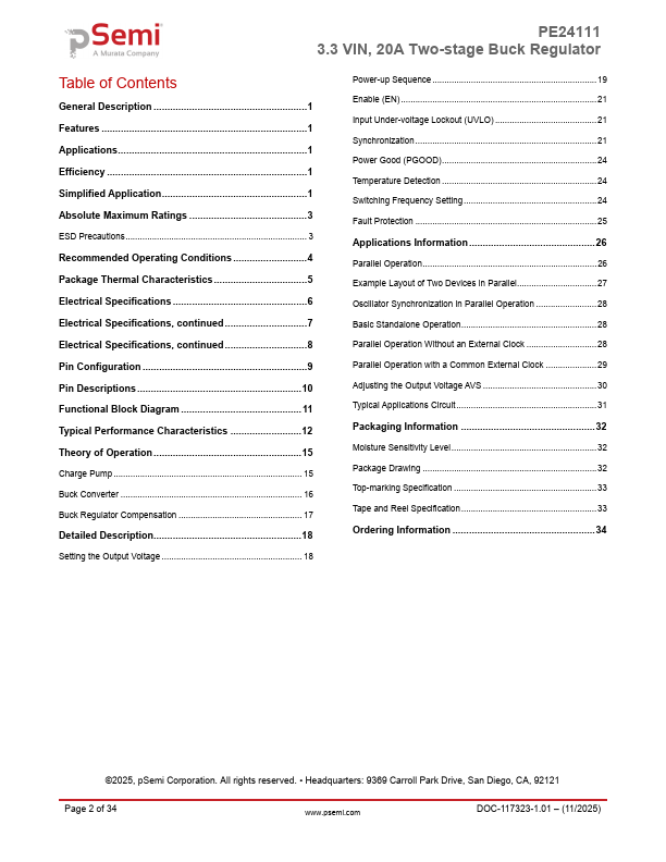 The PE24111 is a compact, low-profile, and ultrahigh efficiency step-down DC-DC converter solution capable of delivering 20A output current from an input voltage range from 3.0–3.6V. The output voltage is set between 0.35V and 0.7V with external feedback resistors and can be adjusted by an external AVS DAC.