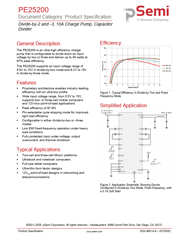 The PE25200 is an ultra-high efficiency charge pump that is configurable to divide down an input voltage by two or three and deliver up to 45 watts at 97% peak efficiency.