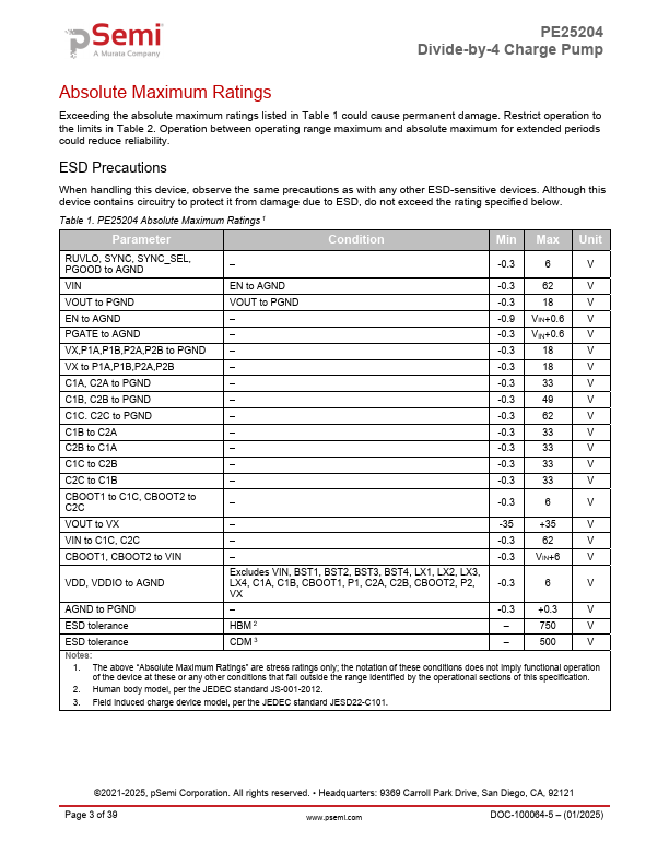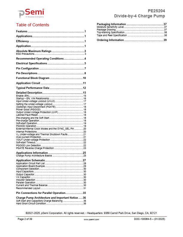 The PE25204 is an ultra-high efficiency charge pump solution that divides down an input voltage by 4 and delivers up to 72W output at up to 96.8% peak efficiency. The PE25204 can also be used in parallel to increase output power. The PE25204 supports an input voltage range of 18V to 60V in divide-by-4 operation. It is available in a WLCSP package measuring 3.6 x 5.8 mm.